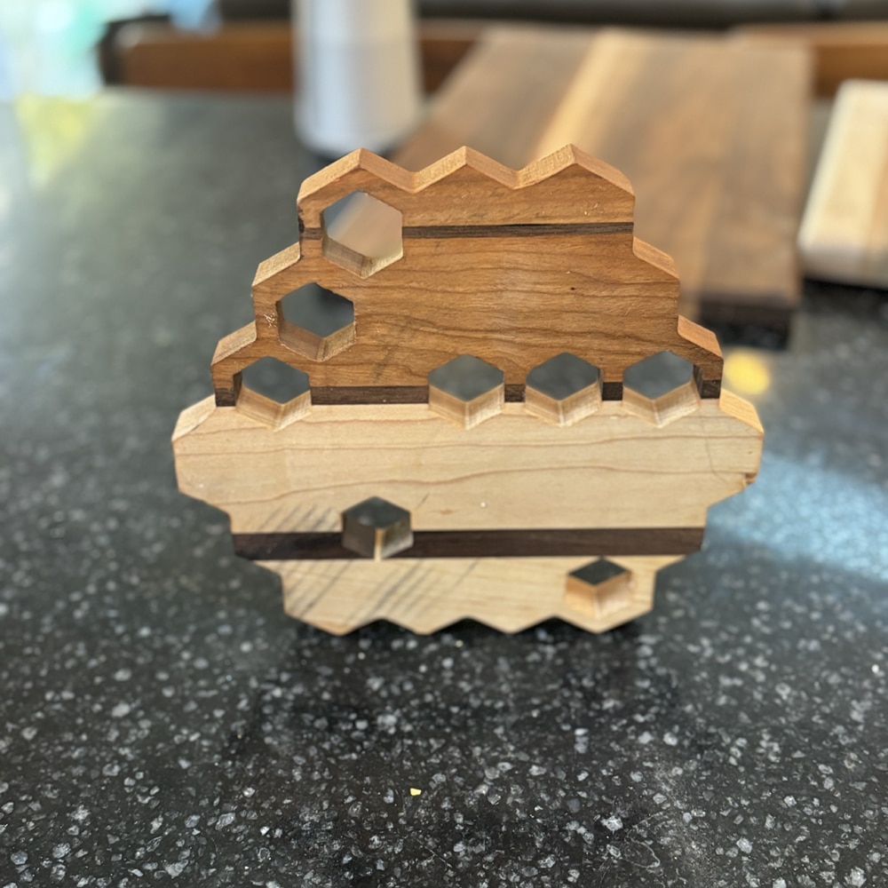 Crafted with care, this hand crafted honey comb shaped natural walnut, maple and charry wood combination coasters showcases the natural beauty of maple, walnut, and cherry wood in a beautiful honey comb. Each piece is hand-selected and expertly assembled to create a durable and visually stunning to complement your coffee table.